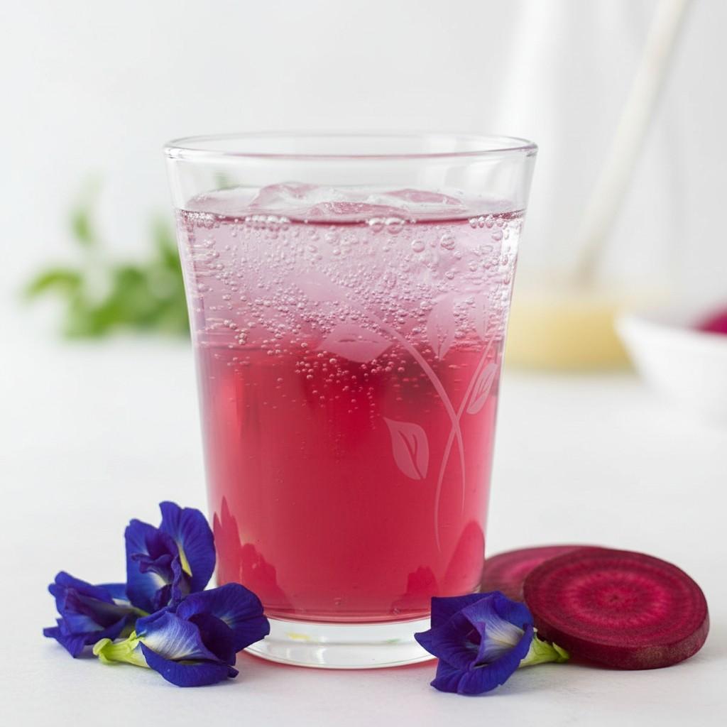 グラスに注ぐと驚くほど美しい桃紫色。これはバタフライピーやビートルートなど、植物由来のアントシアニン等が生み出す自然の鮮やかさです。