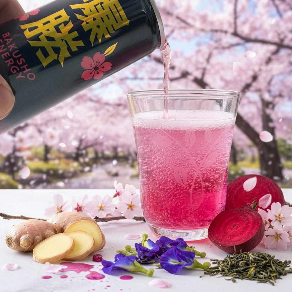 A. 王道のエナジードリンクの風味(フルーツ系)を感じさせつつ、サクラや緑茶、ショウガなどをブレンドしています。アルロースやステビア等を使用した控えめな甘さと強炭酸で、スッキリとした後味が特徴です。